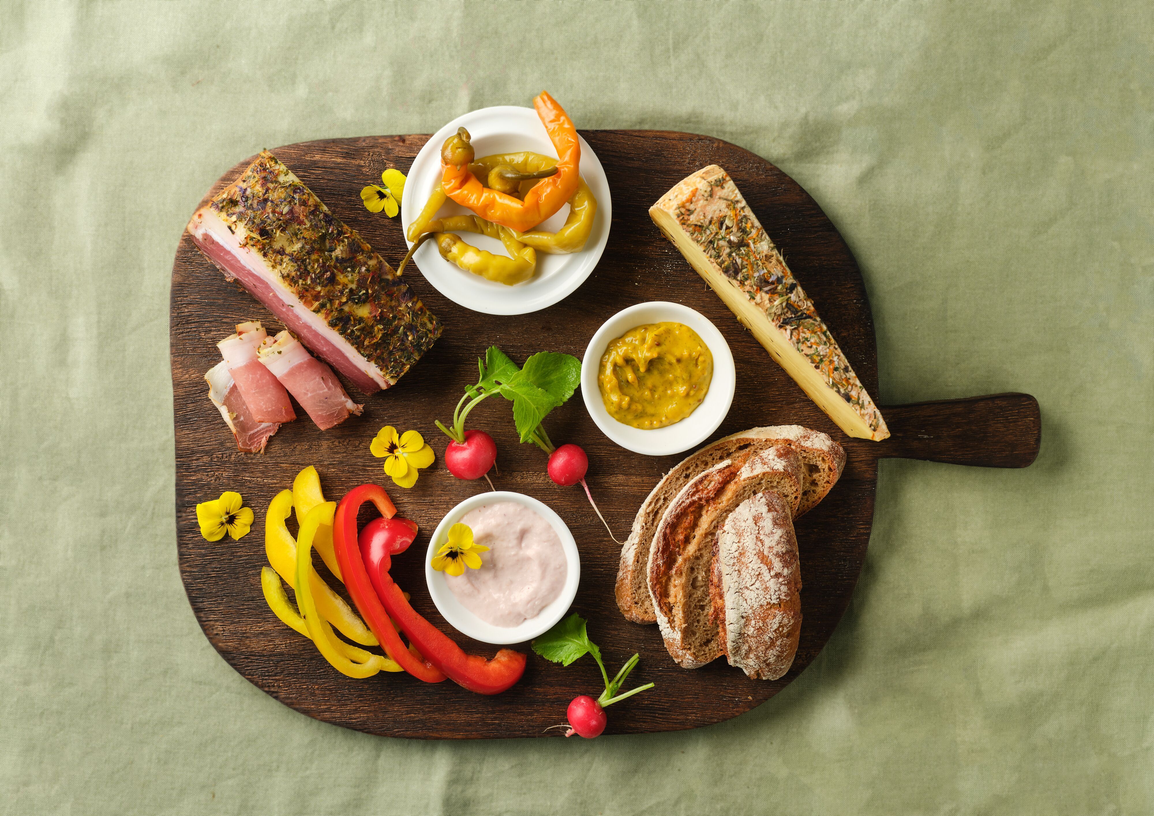 Il n'est pas nécessaire d'être hippie pour aimer les fleurs - après tout, elles ne sont pas seulement belles et colorent la vie, elles ont aussi un goût excellent. (Les fleurs, pas les hippies.) Comme les herbes, elles sont l'épice de la vie et sont donc utilisées non seulement comme assaisonnement pour le fromage et le lard, mais aussi pour affiner les moutardes. Il n'est donc pas surprenant que cette "Brettljause" soit également très riche en goût. Si vous optez pour cette variante, vous gâterez votre palais avec une couronne de fleurs multicolores et pourrez vous servir un peu d'été pour votre moral, même les jours d'hiver. Recommandation inconditionnelle !