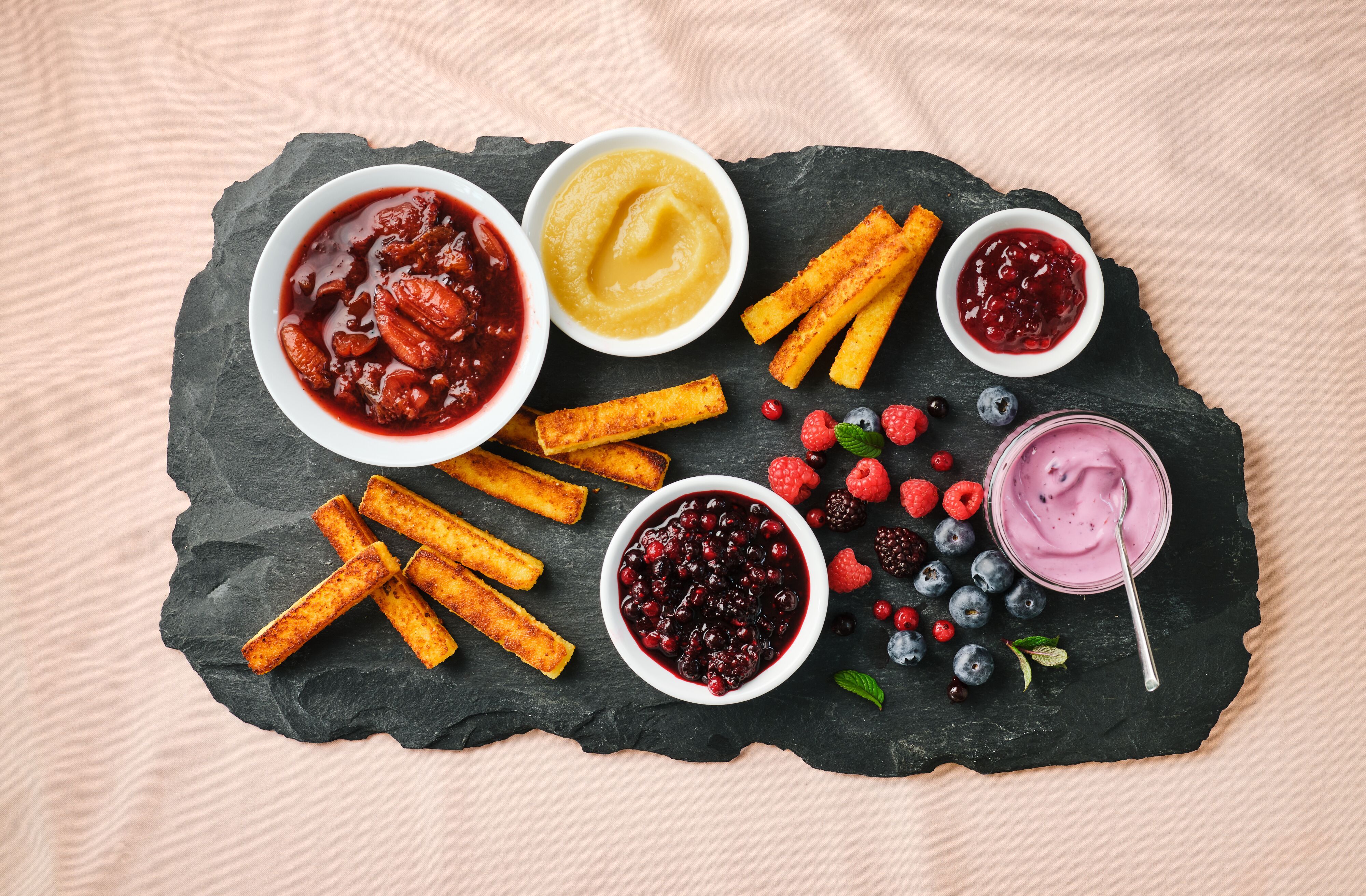 Il est vrai qu'une Brettljause sucrée semble inhabituelle. Mais si l'on considère que la polenta fait partie intégrante de la cuisine tyrolienne depuis des siècles et qu'elle peut être bien plus qu'un simple accompagnement salé, le pas vers le dessert de la Brettljausen n'est plus si loin. En effet, cuit avec du sucre et du lait, coupé en lamelles et grillé dans du beurre à la cannelle, le plat de maïs devient un délicieux accompagnement pour les yaourts aux fruits, les compotes de baies et les compotes de pommes et peut être merveilleusement dipsé dans du quetscheröster et de la confiture d'airelles. Et comme il est toujours possible de manger quelque chose de sucré, cette variante est un complément aux Brettljausen susmentionnées et devrait être appréciée de tous les fans de la cuisine tyrolienne.