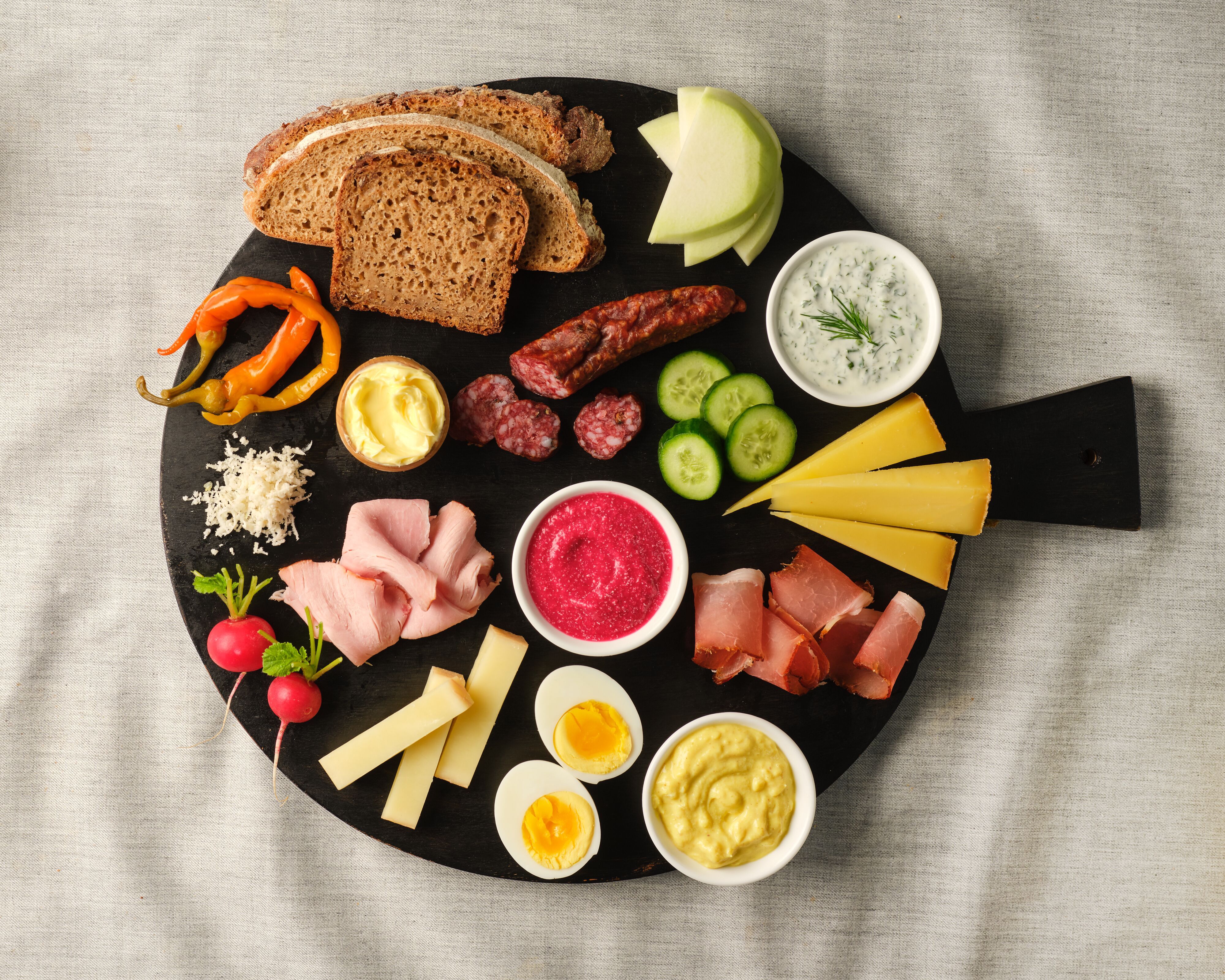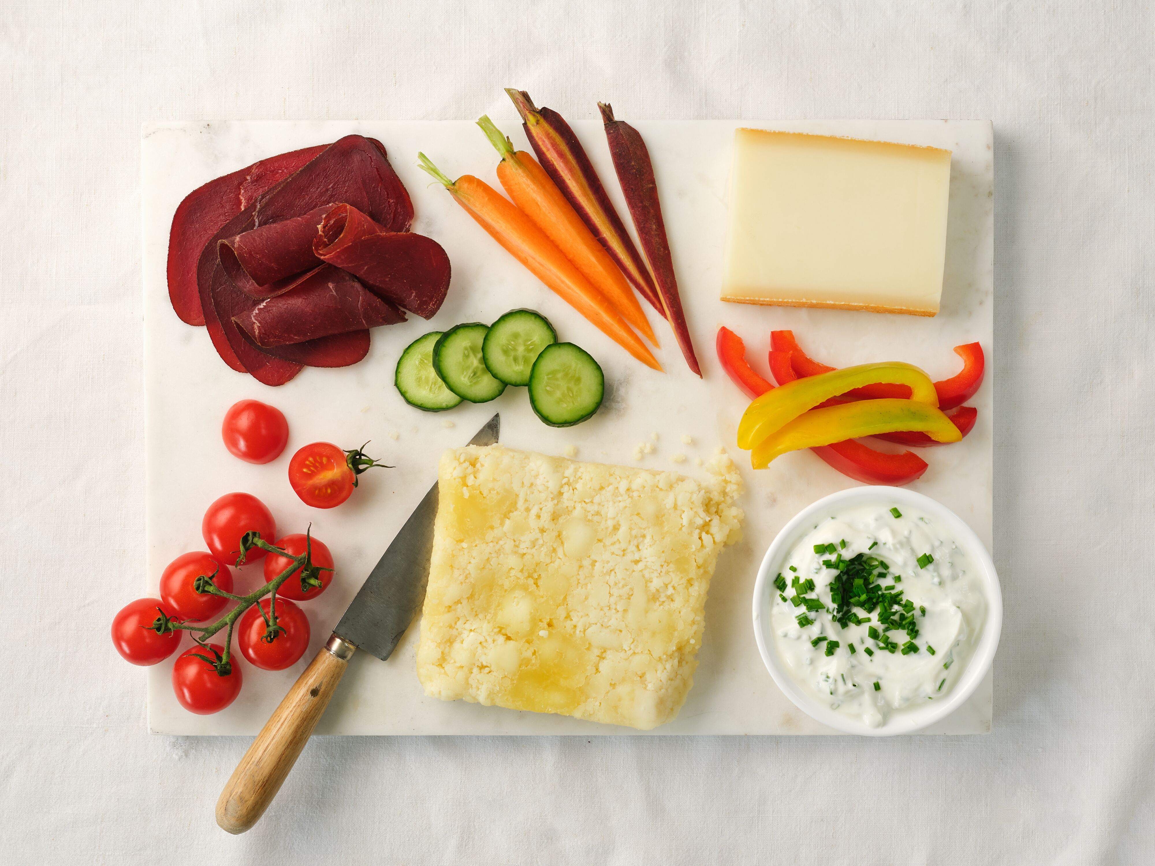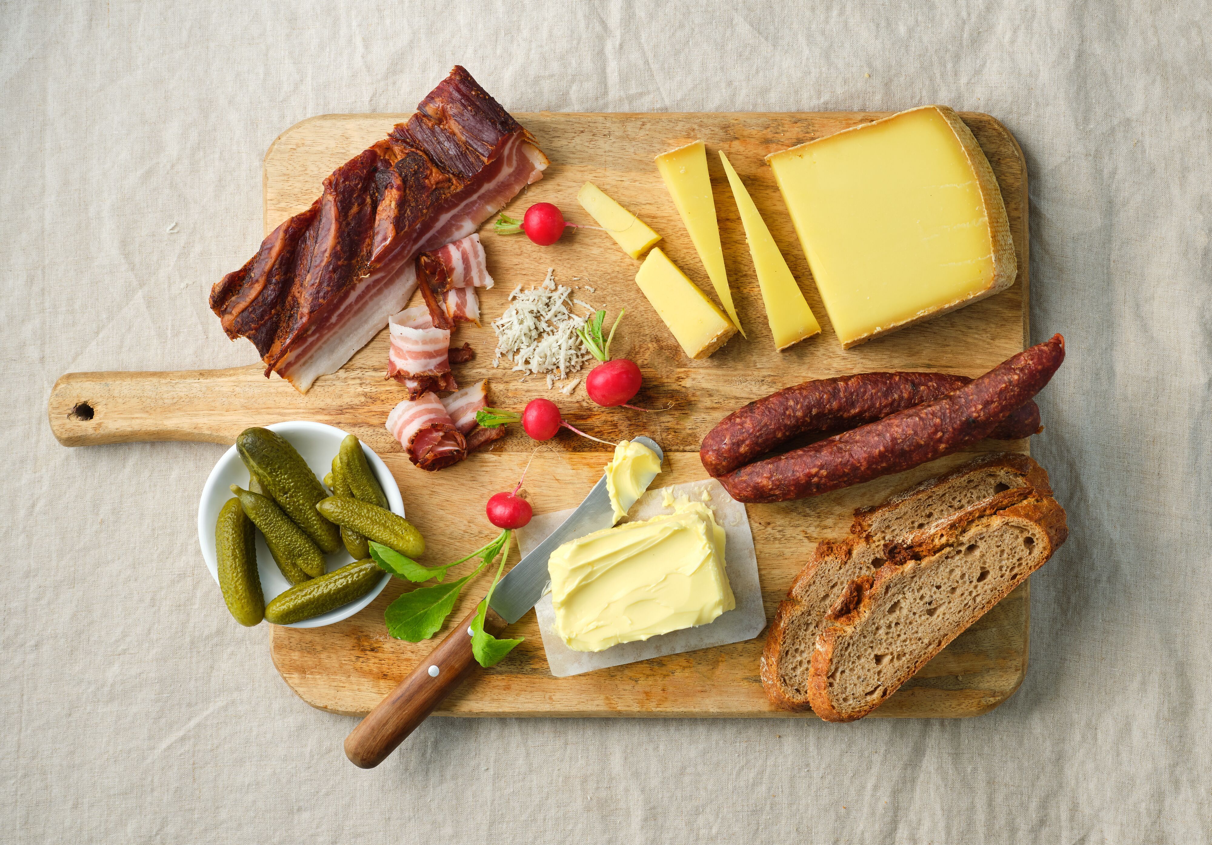 Carême, dîner, petite faim - parfois, la Brettljause peut être un peu moins copieuse. Dans cette variante légère, le goût n'est pas négligé pour autant. Le principal protagoniste de la planche est le fromage gris à faible teneur en matières grasses déjà mentionné, un fromage au lait acidulé sans lactose qui marque des points avec son arôme très particulier. Servi avec du fromage de brebis et du lard maigre sur un lit de légumes frais, ce casse-croûte permet certes d'économiser des calories, mais clairement pas du plaisir. On peut donc s'offrir une ou deux bouchées supplémentaires - sans mauvaise conscience, bien sûr.