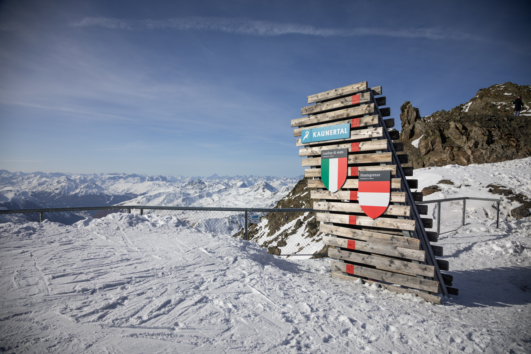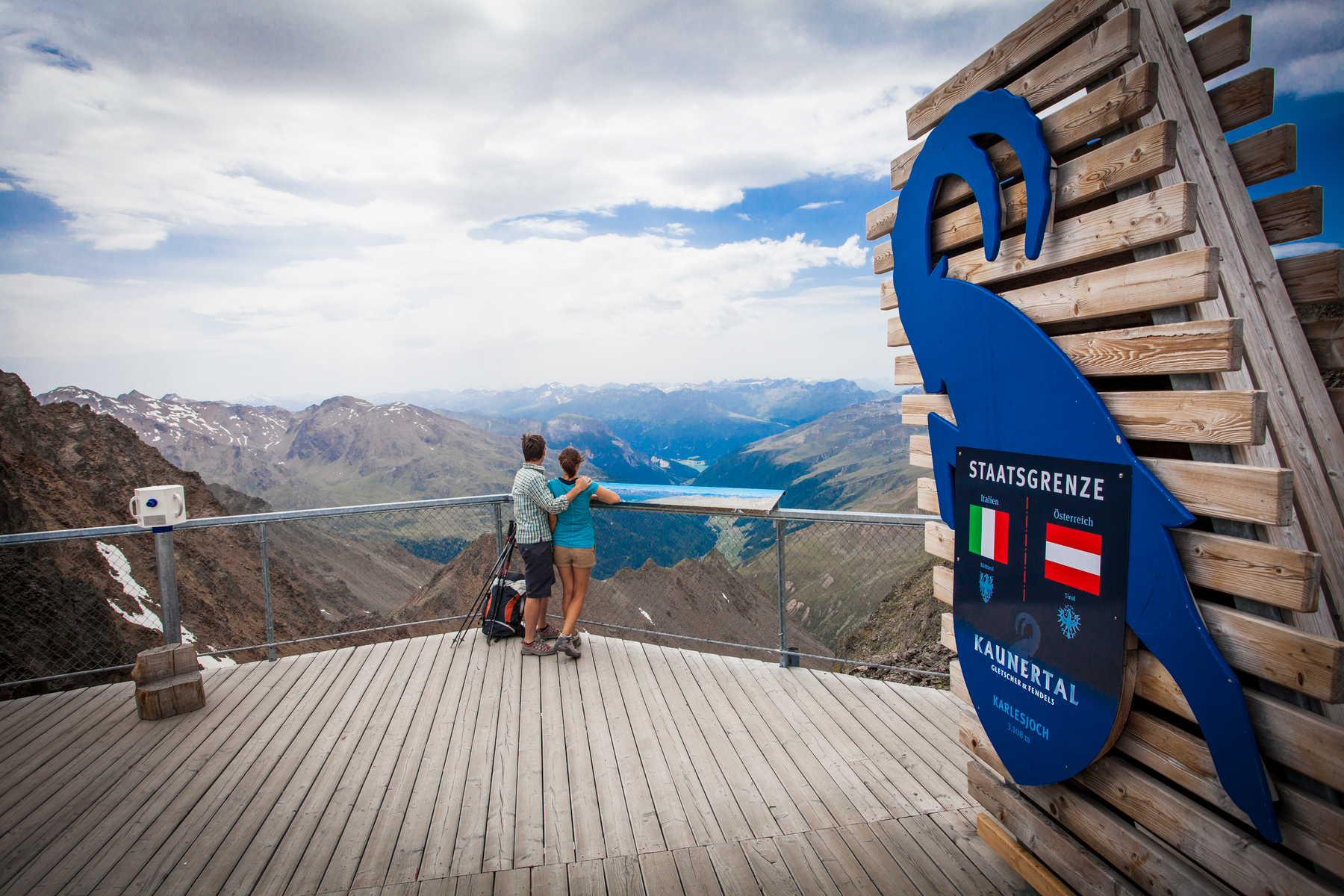 La plate-forme panoramique du Dreiländerblick porte bien son nom : il est possible de se rendre confortablement et surtout sans barrière à plus de 3.000 mètres d'altitude sur le glacier du Kaunertal ! On se trouve à la frontière avec l'Italie, avec une vue sur les plus hauts sommets d'Autriche, d'Italie et de Suisse. Le panorama de montagne qui s'ouvre au visiteur compte parmi les meilleurs des Alpes. La frontière nationale traverse la plate-forme du Karlesjoch, ce qui permet d'avoir un pied en Autriche et un pied en Italie.