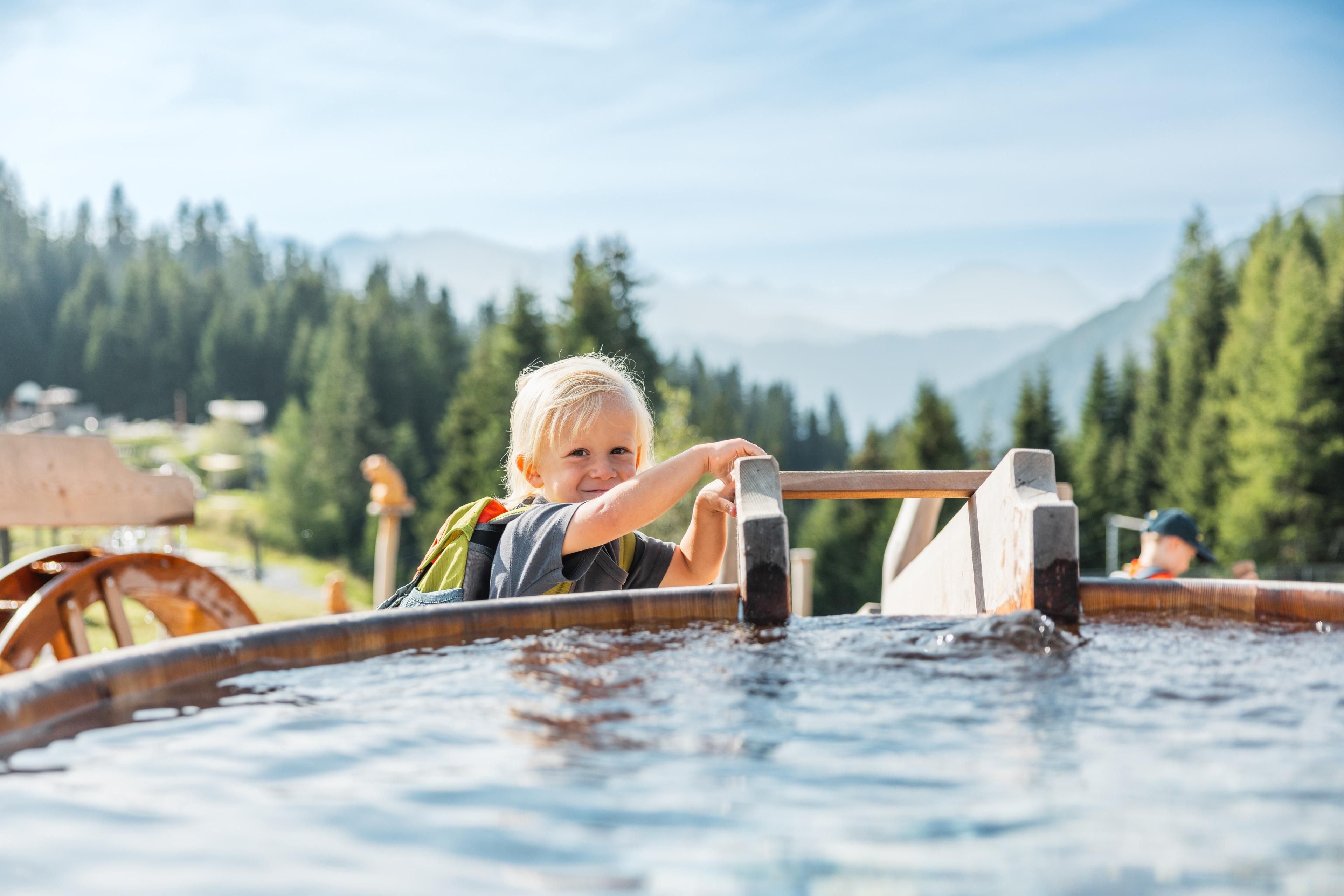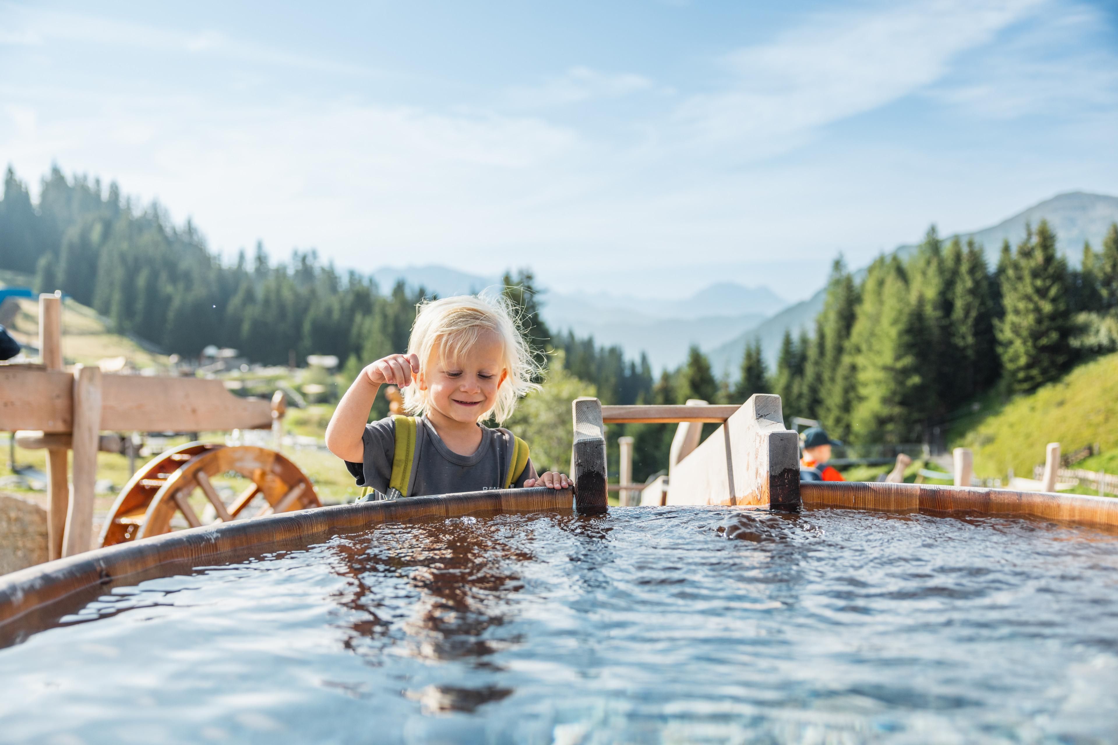 Dans le grand étang en tonneaux de bois, on peut faire la course avec des bateaux que l'on a soi-même fabriqués - et dans la zone de découverte, on cherche de l'or et d'autres trésors.