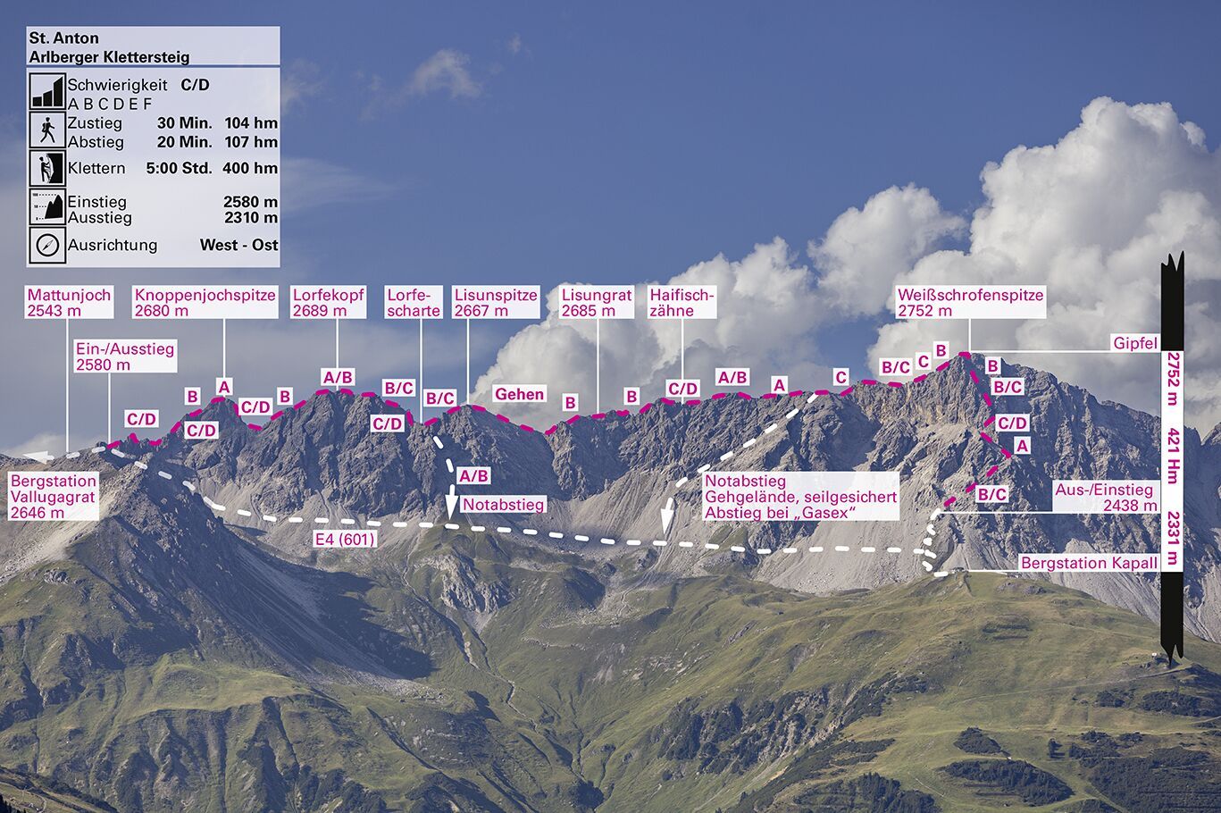 L'alpinisme a généralement pour but d'atteindre un ou plusieurs sommets, et peut impliquer l'utilisation de matériel d'escalade. En revanche, la via ferrata met l'accent sur l'expérience de l'escalade. Une via ferrata au Tyrol peut, mais ne doit pas nécessairement, mener au sommet d'une montagne. Elle peut être définie comme une voie sécurisée avec des câbles métalliques et des marches. La sécurité personnelle qui implique d'être équipé d'un set de via ferrata comprenant un baudrier, un absorbeur d'énergie, au moins deux brins de corde avec mousquetons et un casque, est essentielle.