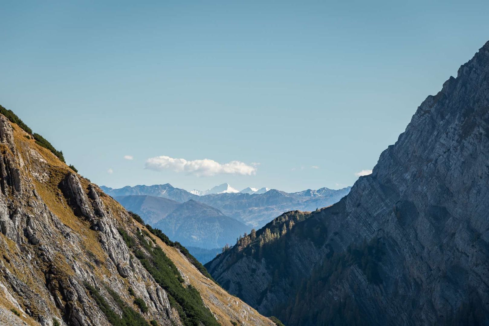 Le chemin forestier se transforme rapidement en un chemin charretier dans la forêt clairsemée, puis en un sentier. Le sentier monte ensuite doucement à travers la charmante vallée d'Untere Filztal, avant de s'enfoncer plus loin dans les alpages (la direction reste pratiquement toujours la même). Peu après, le sentier débouche sur un chemin carrossable. Continuer sur le chemin dans la même direction à travers les prairies jusqu'au col de Hochalmsattel avec la croix Joch. Descendre ensuite sur le chemin sur quelques mètres et tourner à gauche en direction du refuge Karwendelhaus.