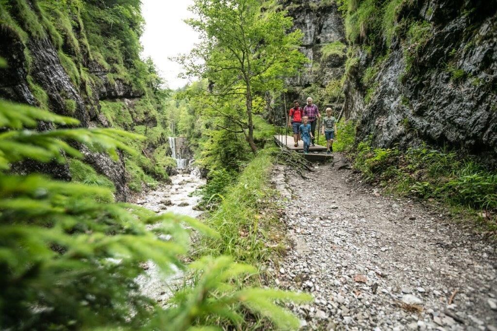 Promenez-vous de l'arrêt de bus Griesbachklamm au Griesbach, à l'écart des maisons et des routes, jusqu'à l'entrée de la gorge. Là, vous vous promènerez le long des parois rocheuses, accompagné par le bruit de l'eau, à travers les gorges. Très vite, vous rencontrez le premier défi, un pont suspendu d'environ 26 mètres de long qui traverse le lit du ruisseau à environ 4 mètres de hauteur. Le chemin se poursuit en partie sur des passerelles qui se trouvent généralement au-dessus du ruisseau. Après le deuxième pont suspendu, vous continuez à droite. Après quelques mètres, le chemin vous fait passer devant une cascade rugissante. Dans la partie suivante, vous profitez du doux écoulement de l'eau et du calme près du lit du ruisseau. Petit à petit, vous marchez au-dessus des gorges en direction de la deuxième cascade. Ensuite s'étend une large vallée avec des bancs de sable sur lesquels on peut jouer et s'installer confortablement. Passez les bancs de sable et suivez la vallée qui se rétrécit jusqu'à un croisement de chemins. De là, continuez à droite à travers la gorge jusqu'à ce que vous arriviez à une route forestière. Ici, vous marchez environ 900 mètres jusqu'au début du Jägersteig. Le sentier de montagne étroit traverse une zone forestière ombragée jusqu'à l'Angerlalm (1.102 m). Longez le chemin de marchandises jusqu'à l'étang de la tourbière. Là, vous tournez à droite sur le sentier qui descend vers le Huberalm (1.080 m). Juste avant le refuge, il y a un beau point de vue sur la Huberhöhe (1.146 m). Vous redescendez à Erpfendorf par l'alpage Jägeralm jusqu'à l'arrêt de bus (Erpfendorf Dorf ou Griesbachklamm). Sur le chemin de l'arrêt de bus Griesbachklamm, une visite des installations Kneipp s'impose.