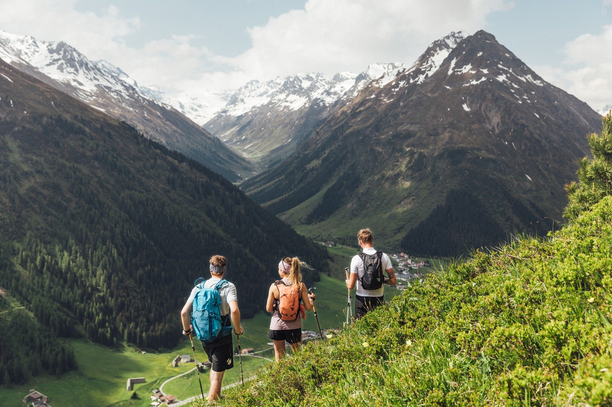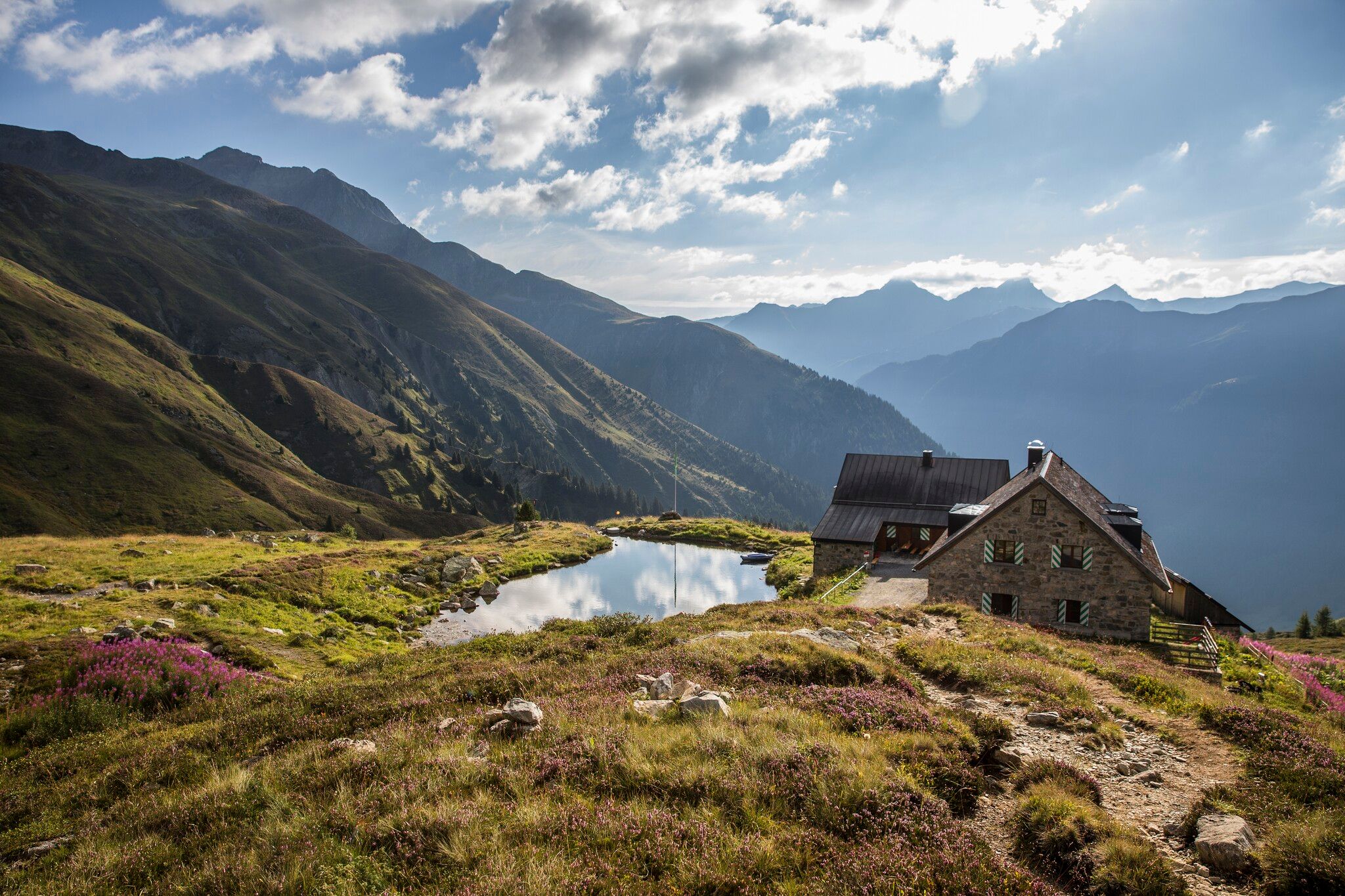 Avec 3,5 heures de marche, l'étape 5 est la plus tranquille des 9 étapes. Il faut néanmoins surmonter 850 mètres de dénivelé avant d'atteindre la destination de l'étape, le refuge Friedrichshafener Hütte. Depuis le centre du village de Galtür, on se dirige vers le quartier d'Außertschafein à 1.560 m d'altitude et de là, on suit les panneaux en direction du refuge Friedrichshafener Hütte. Ce sentier a été aménagé de manière assez exigeante par l'Office tyrolien de gestion des torrents et des avalanches. A deux endroits, des panneaux d'information renseignent sur la végétation, la sylviculture et les mesures d'aménagement. À partir de cette section, on se trouve dans le massif du Verwallgruppe, d'où l'on peut profiter d'une vue panoramique sur le Samnaungruppe, déjà parcouru, de l'autre côté de la vallée. Après avoir passé la crête de l'Adamsberg à environ 2.330 m, le sentier descend légèrement sur le flanc des Hohe Köpfe jusqu'au refuge Friedrichshafener Hütte, situé à 2.138 m d'altitude.
