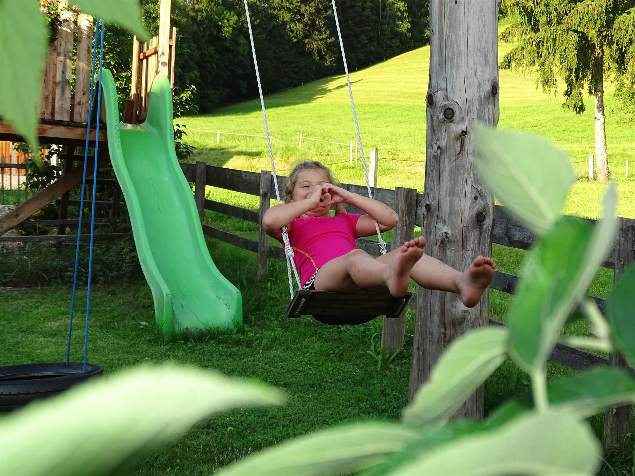 Notre ferme est avant tout un paradis pour vos enfants : pendant que les parents se détendent sur le balcon ou la terrasse, les enfants peuvent explorer les lieux. Loin de la circulation, ils peuvent jouer, courir et se défouler dans le jardin et autour de la maison. La balançoire, le toboggan, le trampoline, la piscine et les petits tracteurs sont là pour eux...Les jeux peuvent se poursuivre dans les champs ou les forêts !