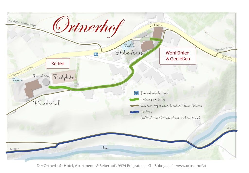 Your HOME in the mountainsAt almost 1,300 m above sea level, far away from everyday life, in the middle of the Hohe Tauern National Park region.The Ortnerhof is a small, fine holiday hotel with own riding stable embedded in the mountain landscape between the impressive mountains Großvenediger and the Großglockner.Our farmhouse has a long tradition, which has been shaped and grown through generations. In the traditional Stubenhaus you will find private and quiet retreats in the typical East Tyrolean farm style. You can enjoy modern and exclusive open space in the in the newly built Stadl apartments, right next door.Culinary pampering: The day begins with a hearty breakfast that provides energy for every holiday adventure. In the evening we serve a delicious menu in three courses in our cozy restaurant rooms.Local, fresh & enjoyable. Because it tastes best that way. In our kitchen we consciously use products from high-class producers from Tyrol and Austria. Preferably even from our valley and East Tyrol.Feel the freedom and experience feelings of happiness together while mountain biking and horse riding along the turquoise blue glacier river towards the head of the valley and the highest peaks in Austria.Breathe deeply and recharge your batteries: open the front door and step out into the magnificent natural and mountain landscape. Then relax and enjoy in the sauna or infrared cabin. A pampering massage will do you good.Look forward to a unique mountain holiday on the south side of the Alps. Wild nature, quiet peaks, fresh air and clear water. And... we have a lot of freedom to discover, experience and enjoy. See you soon at the Ortnerhof.Your Kratzer family with stuff team