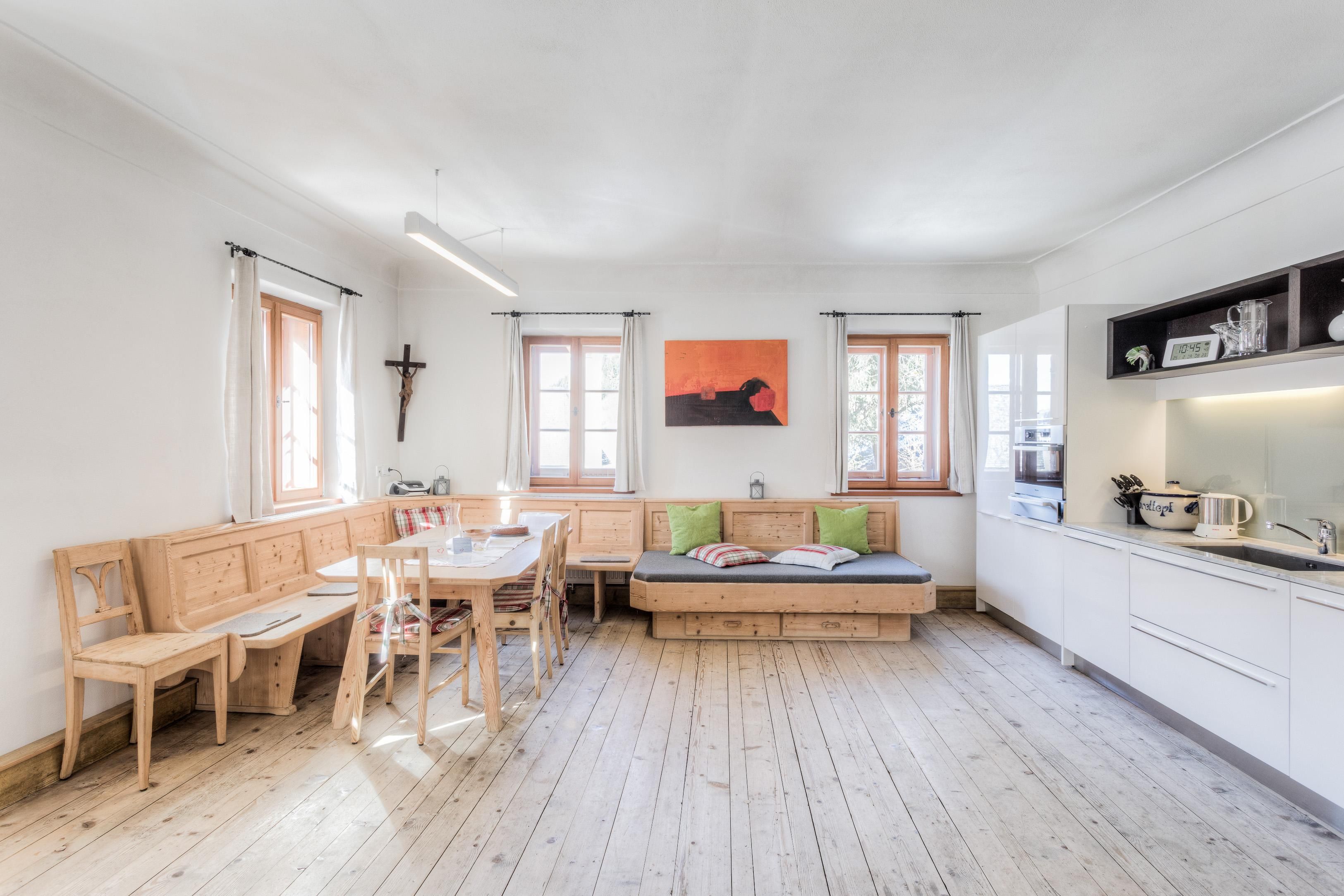 La Tassenbacherhof À l'entrée de la petite route du village, dans la vallée pittoresque de la Puster, se trouve le Tassenbacherhof, situé de manière centrale, entouré des Alpes carinthiennes et des Dolomites imposantes de Lienz et du Tyrol du sud. Dans la maison historique rénovée en 2012 avec amour, une histoire vieille de plusieurs siècles s'allie avec l'architecture la plus moderne qui répond à toutes les envies. Dans notre appartement de luxe tout équipé, des pièces baignées de lumière sur une surface de 250 m² pour 6-10 personnes vous attendent. Détendez-vous directement dans le sauna finlandais intégré à l'appartement avec fonction sanarium et dans la salle de détente en pin montagnard. Pour se détendre, vous avez à disposition un grand canapé avec écran plat SAT TV, un coin bibliothèque et le Wifi gratuit. Cuisinez avec moi votre pain savoureux dans le four en bois et effectuez grâce à mes cours de cuisine un voyage gastronomique à travers les spécialités régionales et les herbes aromatiques locales. La Tassenbacherhof est le point de départ idéal pour des randonnées simples et difficiles dans les montagnes du Tyrol oriental. Des chemins cyclistes en asphalte sur des kilomètres ou des chemins de VTT à travers la forêt et les prairies se trouvent sur le pas de la porte. De plus, il existe de nombreuses autres activités de loisirs dans notre région de vacances de la Haute vallée de la Puster. Faire de l'escalade, randonner, pêcher, faire du rafting, du canyoning, du parapente, découvrir l'environnement au Loakererlebniswelt, Vitalpinum (monde de découverte des univers aromatiques), luge estivale, parc sauvage, trajets en coches, shopping à Lienz et dans le Tyrol du sud. Est-ce que je vous ai convaincu ? Les choses simples de la vie sont les meilleures ! Bienvenue Margit Aigner